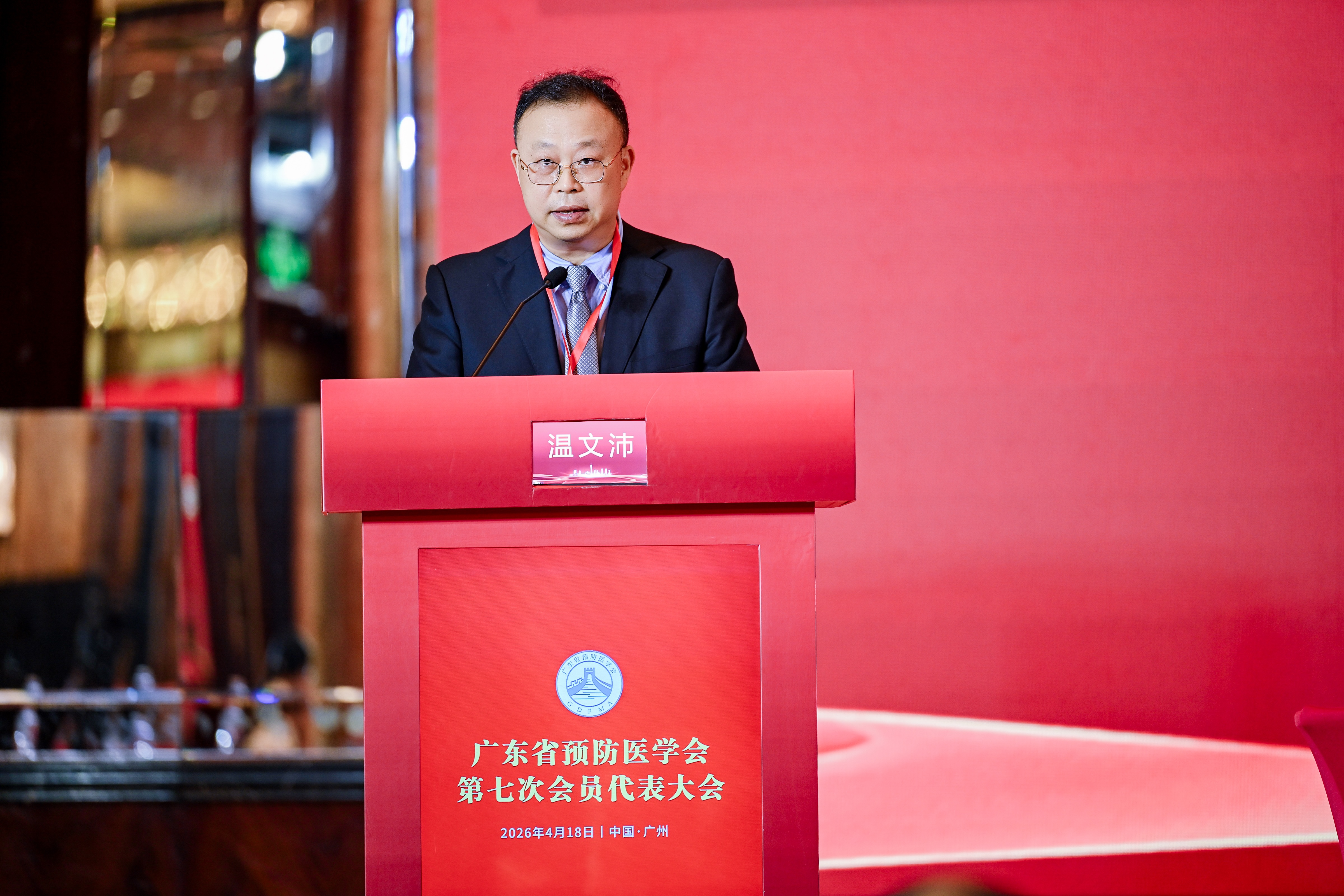 广东省卫生健康委员会党组书记、主任刘利群代表省卫健委对大会的召开表示热烈的祝贺,向第六届理事会及全省公共卫生一线工作者致以崇高敬意与诚挚慰问。他对学会在学术品牌打造、健康科普宣传、新冠及登革热等突发传染病疫情防控等方面的突出贡献表示充分肯定。刘主任强调,要深入学习贯彻习近平总书记 2026 年全国两会关于健全公共卫生体系重要讲话精神,坚决落实“两个坚定不移”重要要求,始终把预防为主摆在更加突出位置,推动健康治理关口前移、重心下沉。他对新一届理事会提出三点要求:一是要主动融入健康中国、健康广东建设大局,持续当好政府、行业、专家与群众间的桥梁纽带;二是聚焦重大传染病防控、慢性病综合干预、医防协同医防融合、数字化赋能等重点领域,搭建高水平跨学科学术平台,积极参与标准制定和政策评估;三是全面加强党建引领、从严规范内部治理,做好带头示范作用。